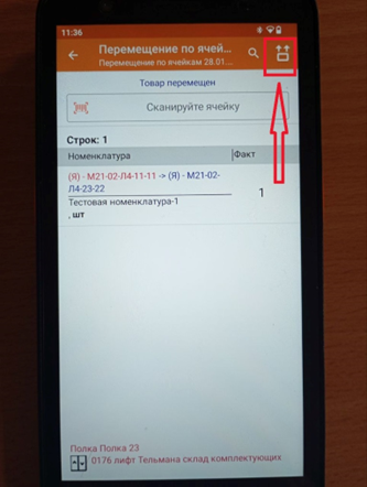 Скан – Сканируем ячейку П1-1-Л1-1-1 вызываем полку. Сканируем Тестовую номенклатуру и сканируем полку приемник П1-1-Л1-2-1. Первая полка уезжает и выезжает полка-приемник, кладем туда Тестовую номенклатуру и возвращаем (кнопка вверху со стрелочками). Выходим из документа. Завершить.