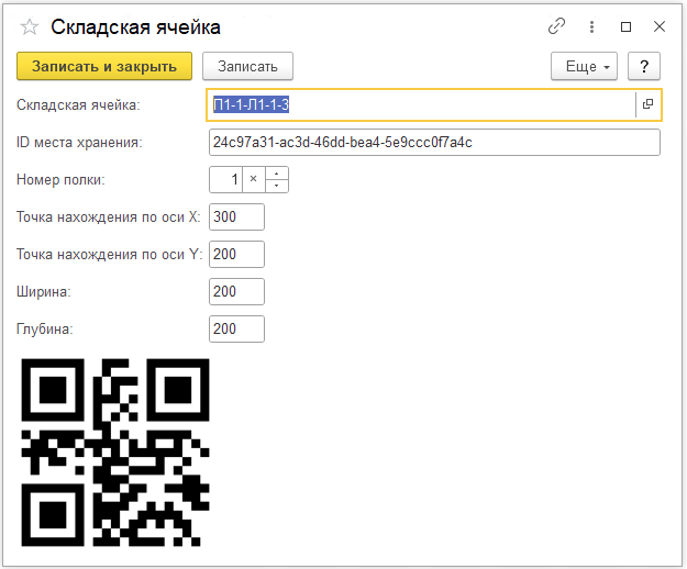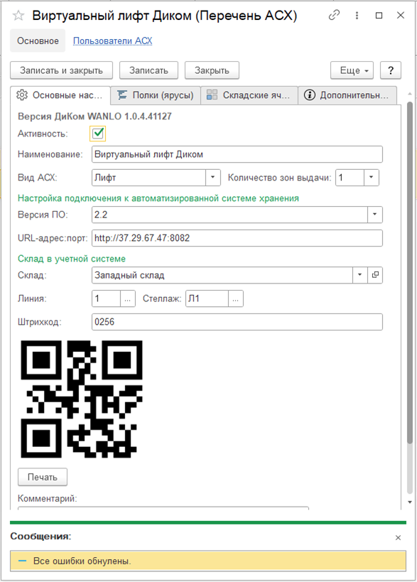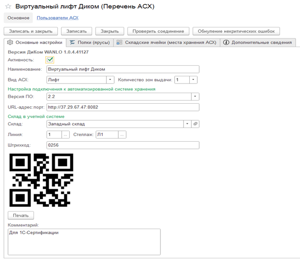 На вкладке «Складские ячейки (места хранения АСХ)» можно задать соответствие между ячейками склада «1С:Предприятия» и полками лифта, а также задать параметры ячейки (ширину, глубину, точки нахождения на осях Х и Y). А внизу выводится QR из карточки ячейки в учетной системе “1С:Предприятие” для быстрого сканирования с ТСД.