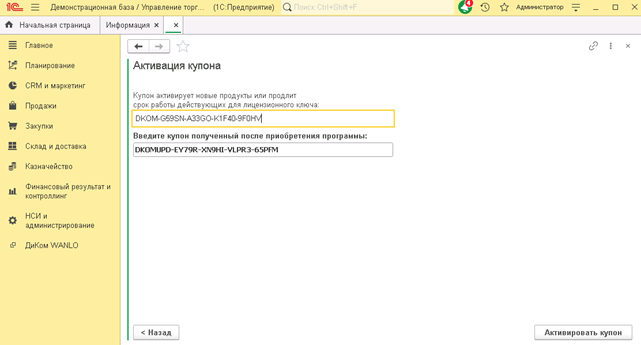 Если вы приобрели лицензионный ключ расширения «ДиКом WANLO», и пробный период еще не закончился, вы можете сразу активировать коммерческую версию. Для этого нажмите «Регистрация продукта» - «Перейти к активации продукта» и введите в верхнее поле ваш ключ на пробный период, а в нижнее – купон (коммерческий ключ, который вы получили после оплаты расширения) и нажмите кнопку «Активировать купон» (см. рис. 16,17,18)