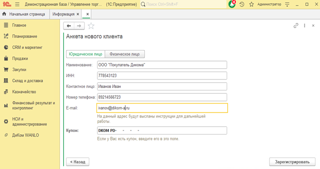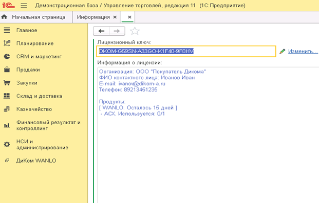 Для запуска процедуры регистрации откройте расширение «ДиКом WANLO» и далее, Сервис – Регистрация продукта. (см. рис. 11). Введите регистрационные данные и нажмите кнопку «Зарегистрировать». (см. рис. 12)