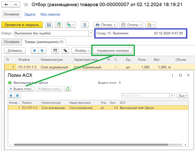 При включении опции «Управление полками из документов «Отбор (размещение) товаров»» в форме документа «Отбор (размещение) товаров» появляется кнопка «Управление полками», нажав на которую можно перейти в форму управления полками (см. рис.22, выделено зеленым).