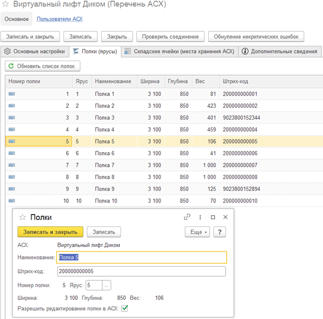 В форме редактирования полки можно произвольно указать ее штрихкод, привязку к ярусу складского места, разрешить или запретить редактирование полки на стороне лифта. При нажатии на кнопку «Записать» («Записать и закрыть») реквизиты полки будут выгружены в лифт (см. рис.33).