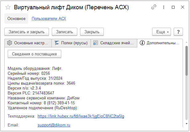 - Линия и Стеллаж. Если у склада в «1С:Предприятие» включена адресность и настроен учет по ячейкам, то необходимо указать какой линии и какому стеллажу соответствует ваш лифт.