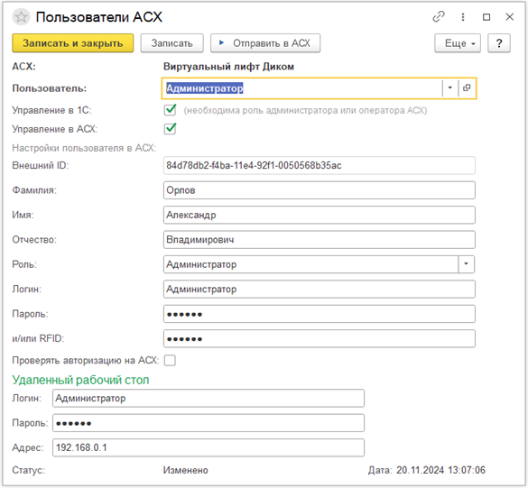 Удаленный рабочий стол – это данные для подключения к удаленному рабочему столу, например, вашего ПК прямо с монитора лифта, когда возникает необходимость что-то уточнить и не бежать к рабочему месту «1С:Предприятие».
