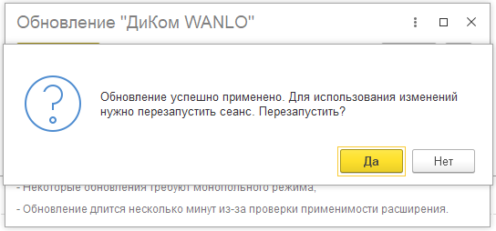 После успешной установки обновления будет предложено перезапустить сеанс «1С:Предприятие». (см. рис.5)