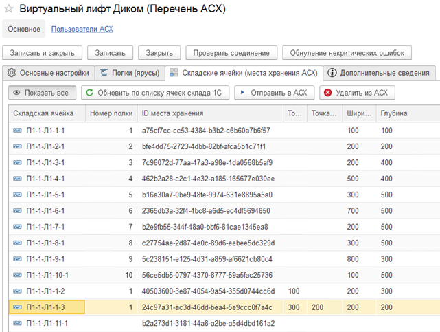 Кнопка «Обновить по списку ячеек склада 1С» выводит список ячеек склада, привязанных к данному лифту и отправленных в АСХ (т.е. тех, у которых введены координаты), а также обновляет параметры этих ячеек, если их скорректировали с помощью ПО лифта. (см. рис. 34,35)