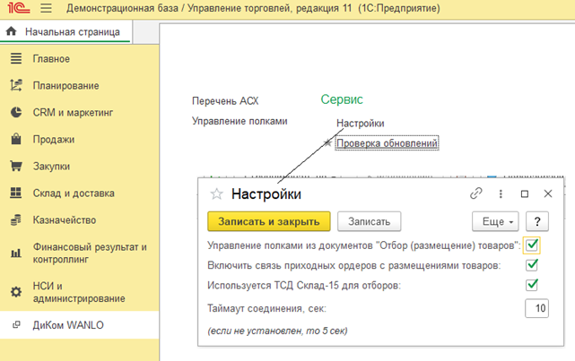 Если предполагается управление полками из документов «1С:Предприятие» «Отбор (размещение) товаров», и / или используется ТСД «Склад 15» https://www.cleverence.ru/WH15), надо включить соответствующие опции. Кроме того, можно задать таймаут соединения ответа сервера (см. рис.23).