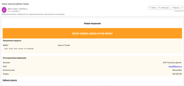 На указанную в регистрационных данных почту придет этот же ключ. (см. рис. 15)