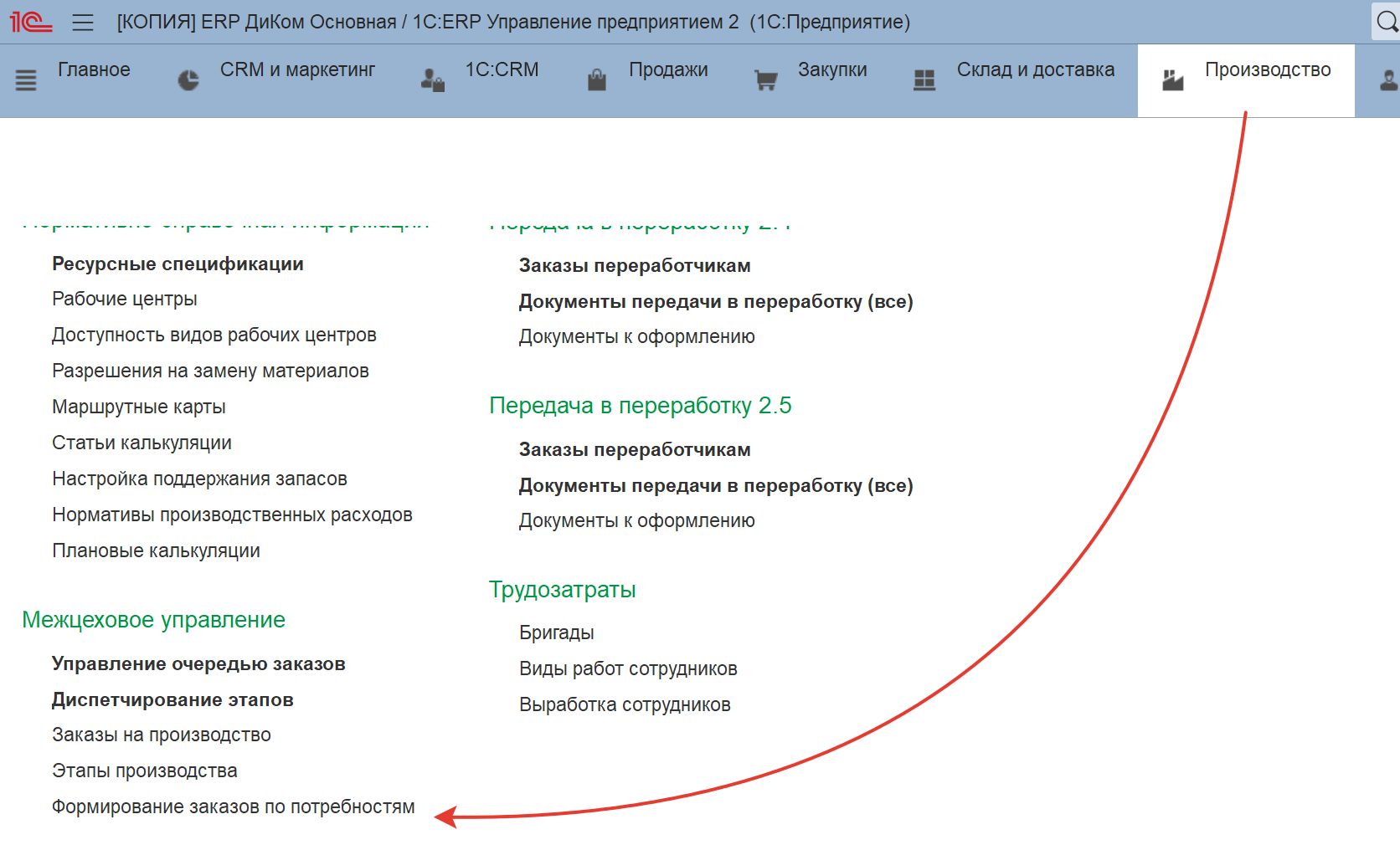 Обработка представляет собой "помощника" с последовательными шагами и позволяет создавать документы "Заказ поставщику", "Заказ на производство", или "Заказ на перемещение". Доступ к ней осуществляется через: