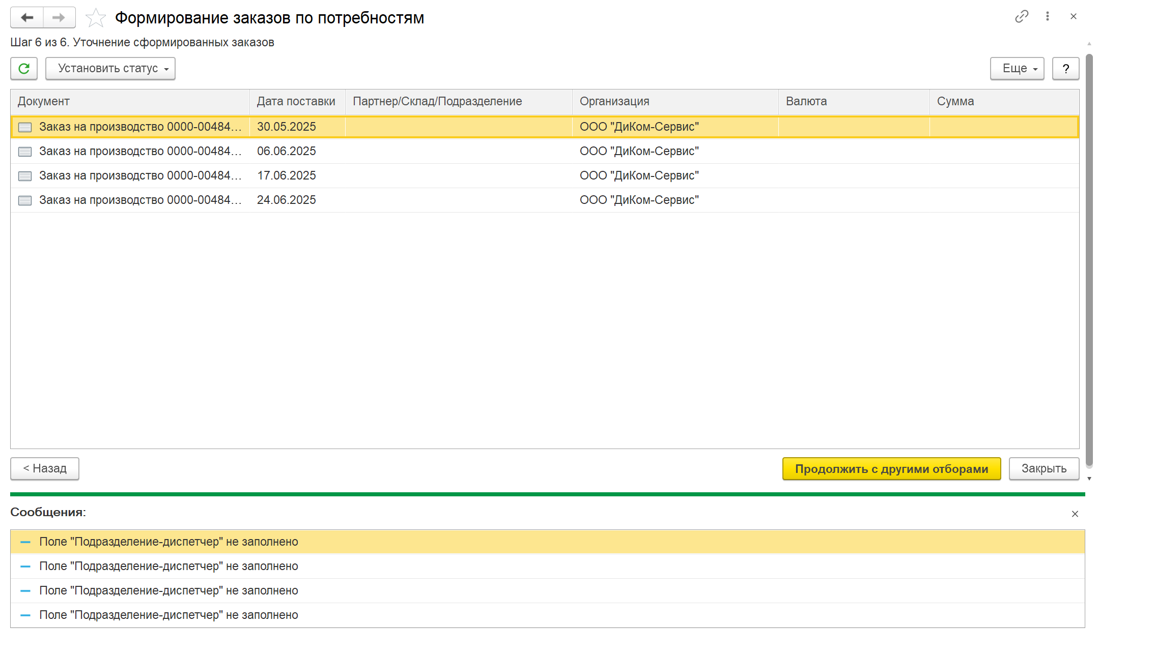 - Кнопка "Продолжить с другими отборами" позволяет вернуться на первый шаг и сформировать новые заказы по другим параметрам.