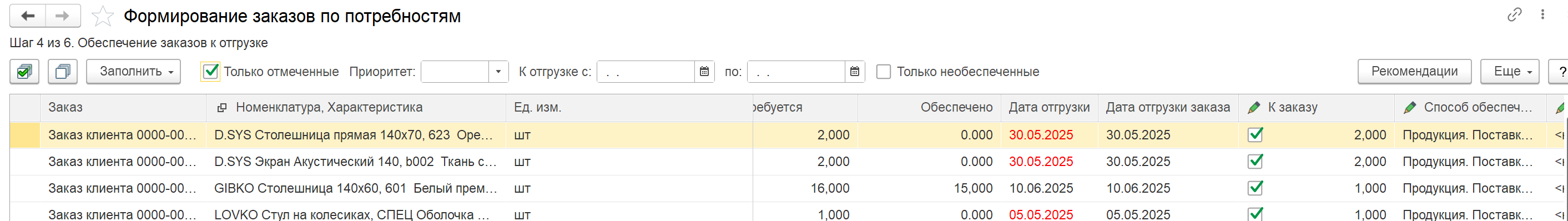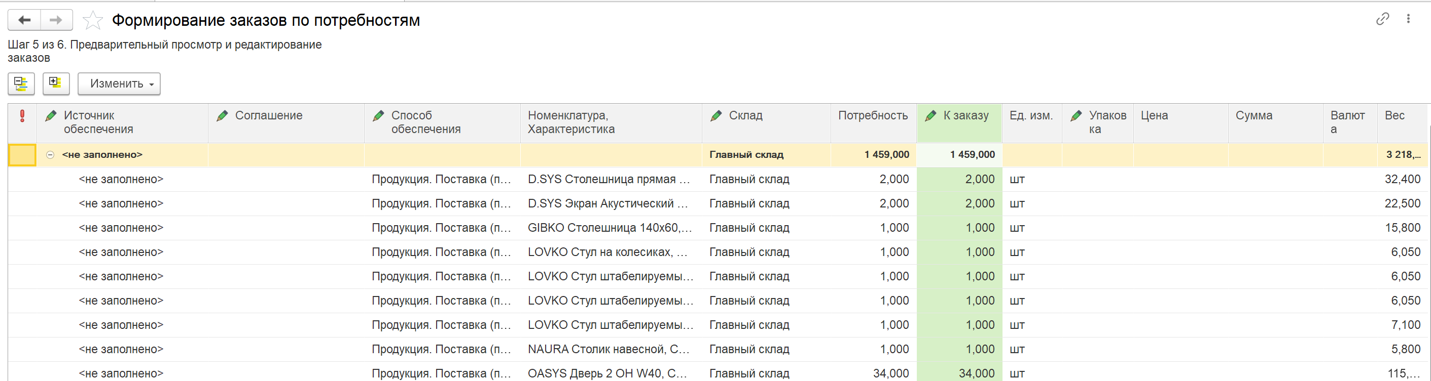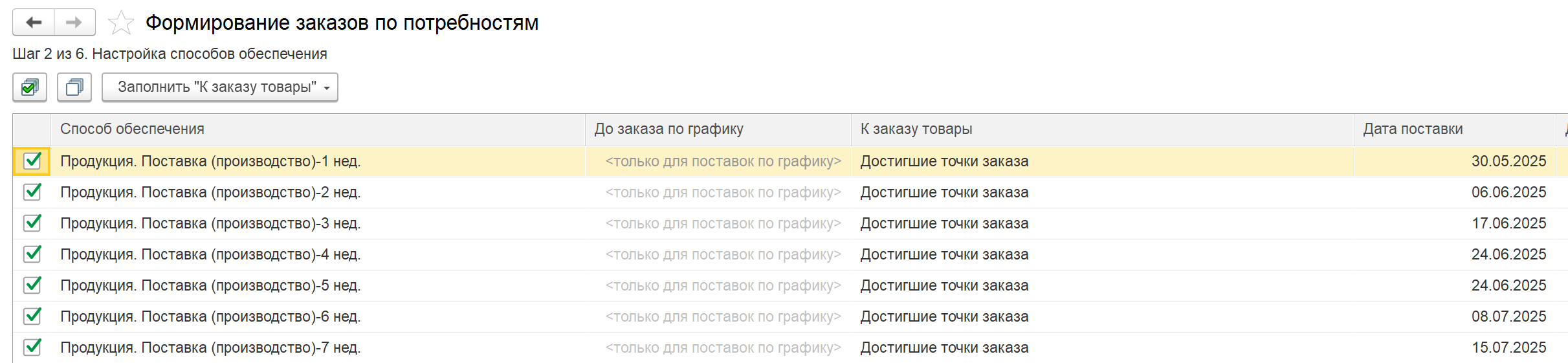 На этом шаге формируется предварительный список номенклатур, которые будут заказаны в соответствии со способом обеспечения (Заказы поставщикам, Заказы на производство и т.д.).