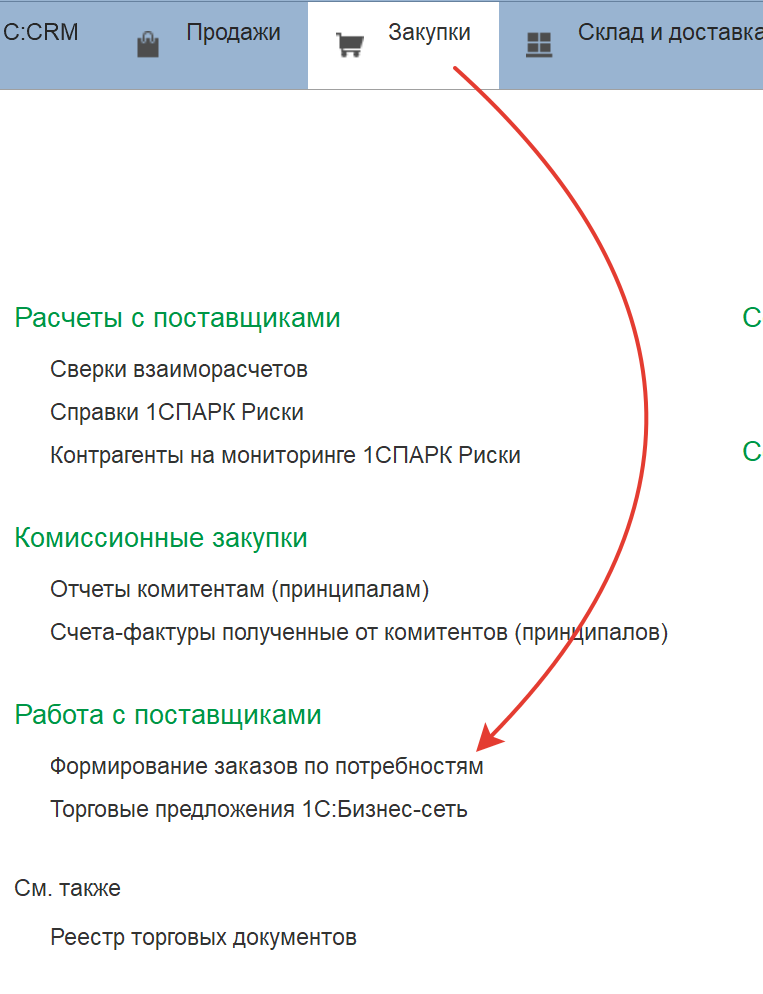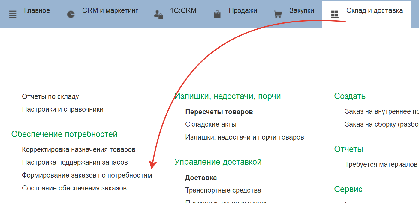 Раздел "Склад и доставка" -> "Обеспечение потребностей" -> "Формирование заказов по потребностям".