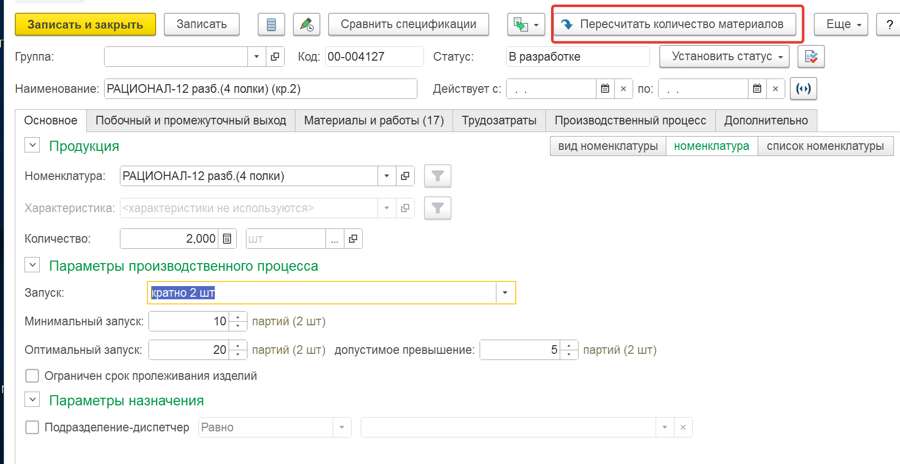 Но работая с этой кнопкой стоит помнить что расчёт она производит пропорционально количеству Основной номенклатуры спецификации. Это значит что если у вас по спецификации было изготовления 1 штуки основного изделия и 2 штуки другого, а вы изменили количество только для основной позиции на 2, то по нажатию на кнопку все материалы будут пересчитаны и увеличатся на 2, что будет не правильно.
