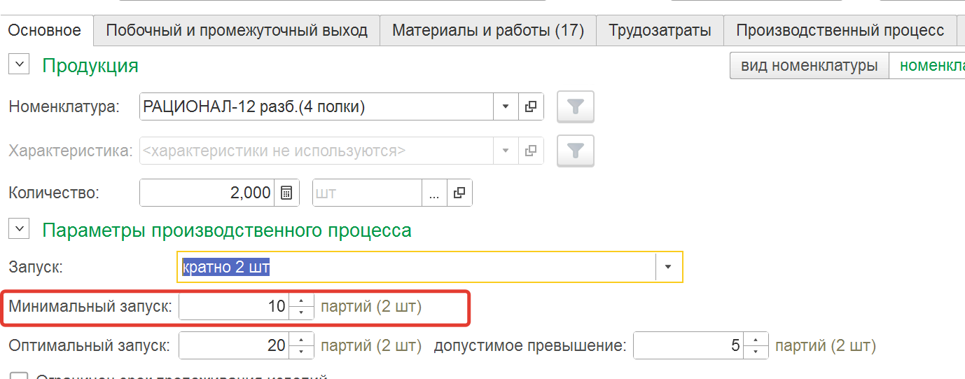 Минимальный запуск указываем в одноименном поле, при этом учитываем что минимальный запуск связан с кратностью. Если кратность указана, то минимальный запуск указывается для количества партий. Например в заказе 5 штук, в спецификации кратность 2, минимальный запуск 10, конечное количество которое будет изготовлено по сформированным этапам - 20 штук. Если параметры кратности не заданы, то минимальный запуск указывается конкретным количеством изделия. Например в заказе на производство 2 шт., спецификация составлена на 10 шт., кратность не задана, а минимальный запуск указан 5 шт., этапы при этом сформируются на 5 штук, количество материалов и работ система сама пересчитает пропорционально количеству.