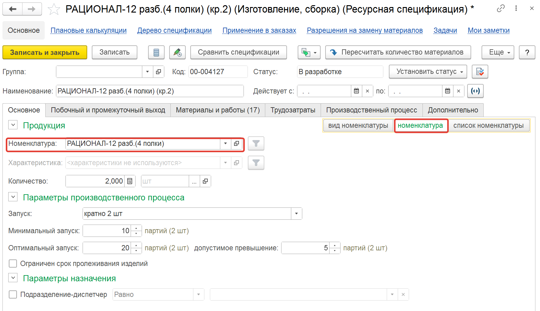 На вкладке "Основные сведения" ресурсной спецификации можно задавать такие параметры как кратность, минимальная/оптимальная партия поставки и допустимое превышение, а также собственно номенклатуру которая производится по данной спецификации.