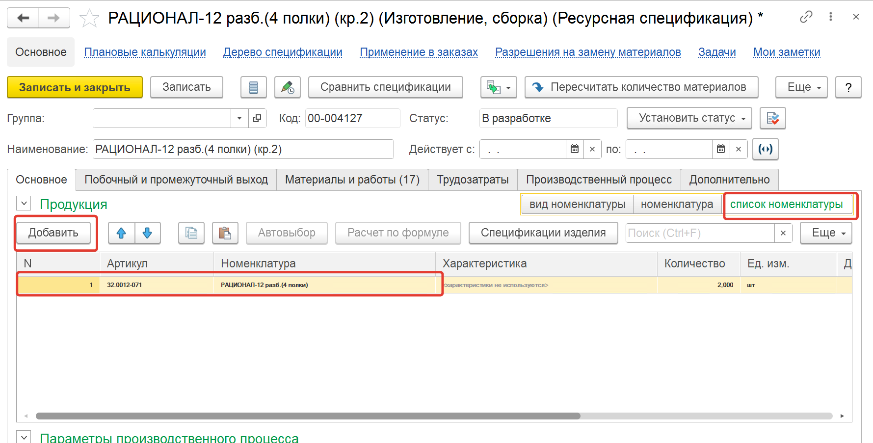 По кнопки добавить добавляем все номенклатуры для которых сделана данная спецификация, при этом только одна из позиций будет отмечена как основная номенклатура спецификации, в списке она будет выделена жирным.