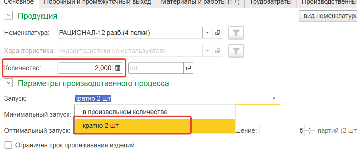 В поле количество указываем то количество кратно которому можно изготавливать по данной спецификации, в поле запуск выбираем параметр Кратно размеру партии. При таких настройках этапы будут формироваться с количеством кратному заданному. например по заказу требуется изготовить 1 штуку, а кратность задана 2 штуки, по этапу будет изготавливаться 1 партия из 2 штук.